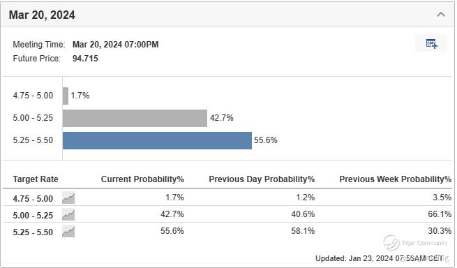 The narrative around imminent interest-rate cuts by the Federal Reserve appears to be losing momentum. CME's FedWatch Tool indicates a 55.6% probability of rates staying the same in March, a shift from an 80% probability of a cut in the second week of January. This comes in the wake of Fed officials cautioning against premature policy adjustments, pushing back against market expectations for a rate cut.