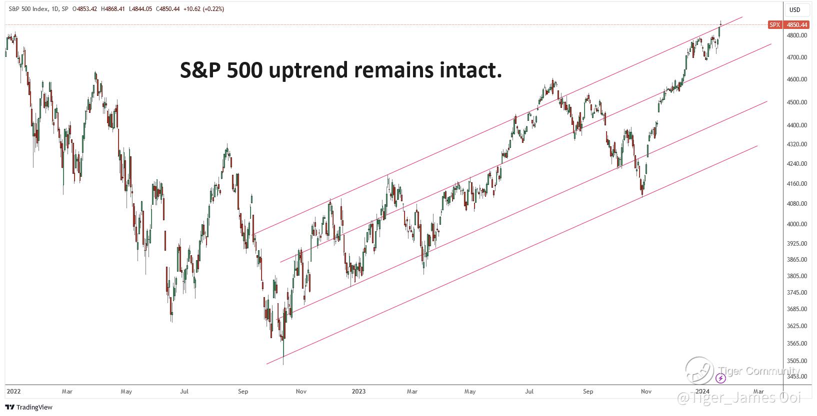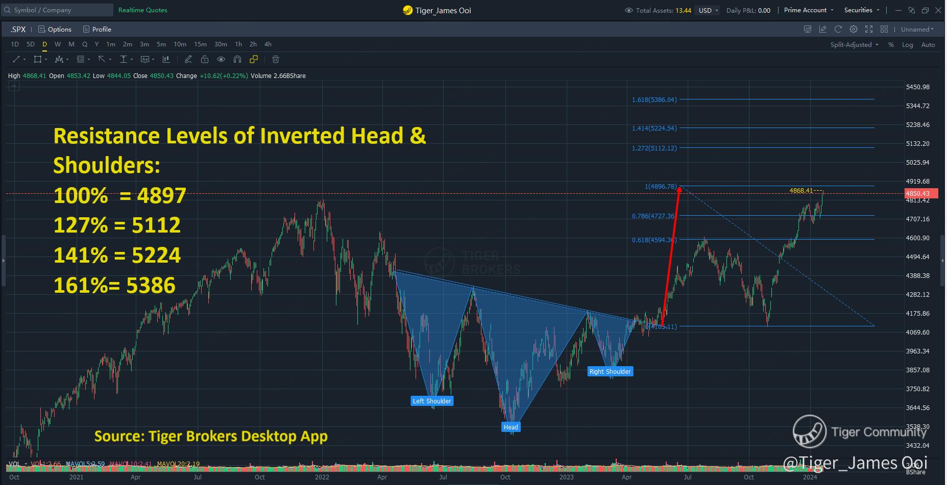 Currently, the S&P 500 is near its 100% target price of the inverted head & shoulders at 4897.