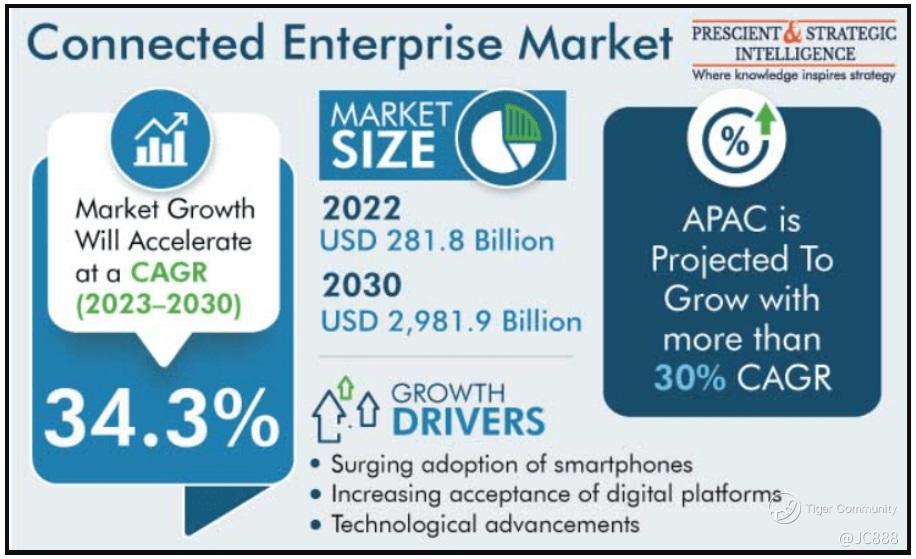 The “Connected Enterprise Market” valued at $281.8 Billion in 2022 is anticipated to grow by over ten folds to 2.98 Trillion by 2030, 8 years’ time. (see above)