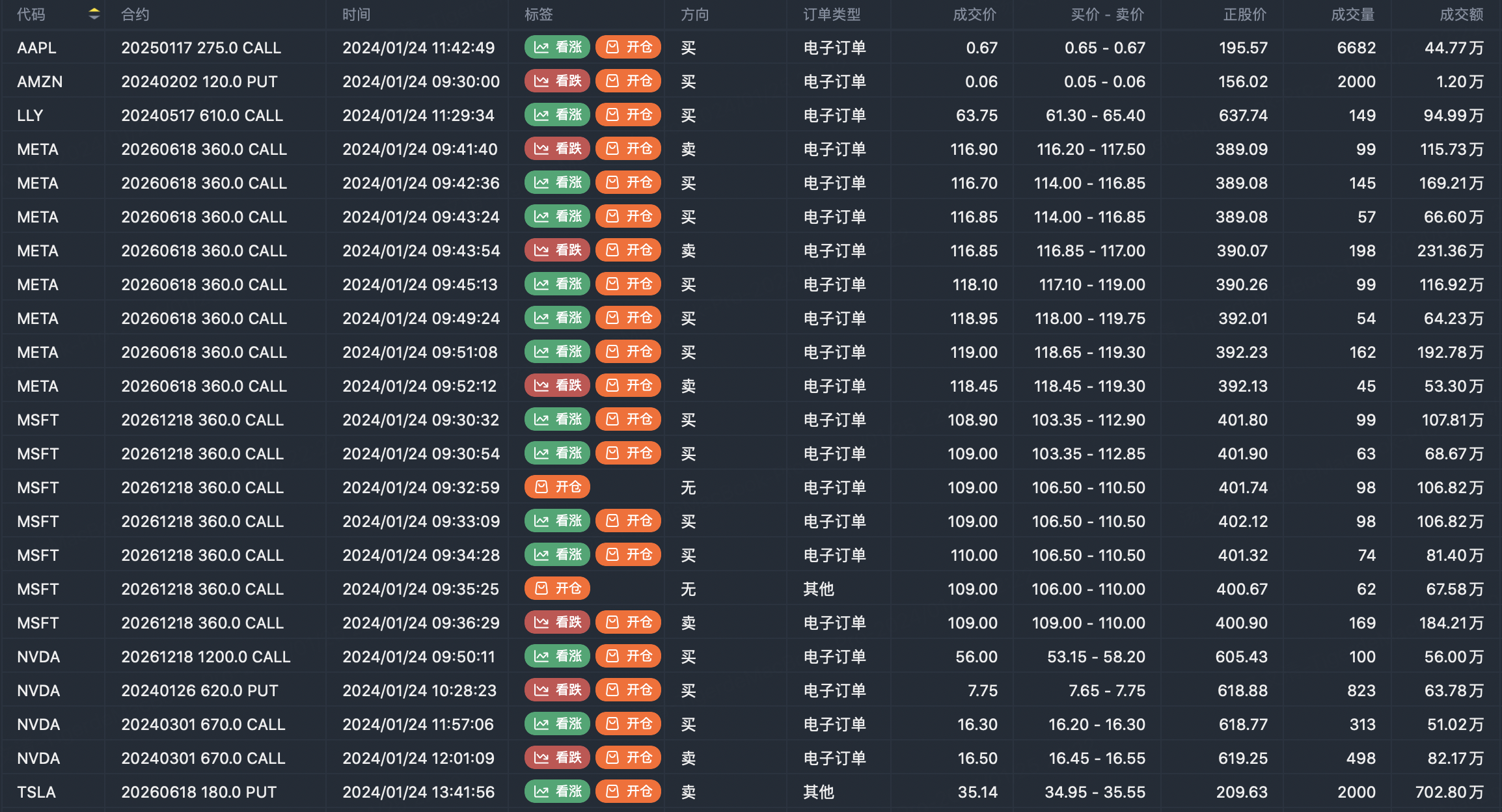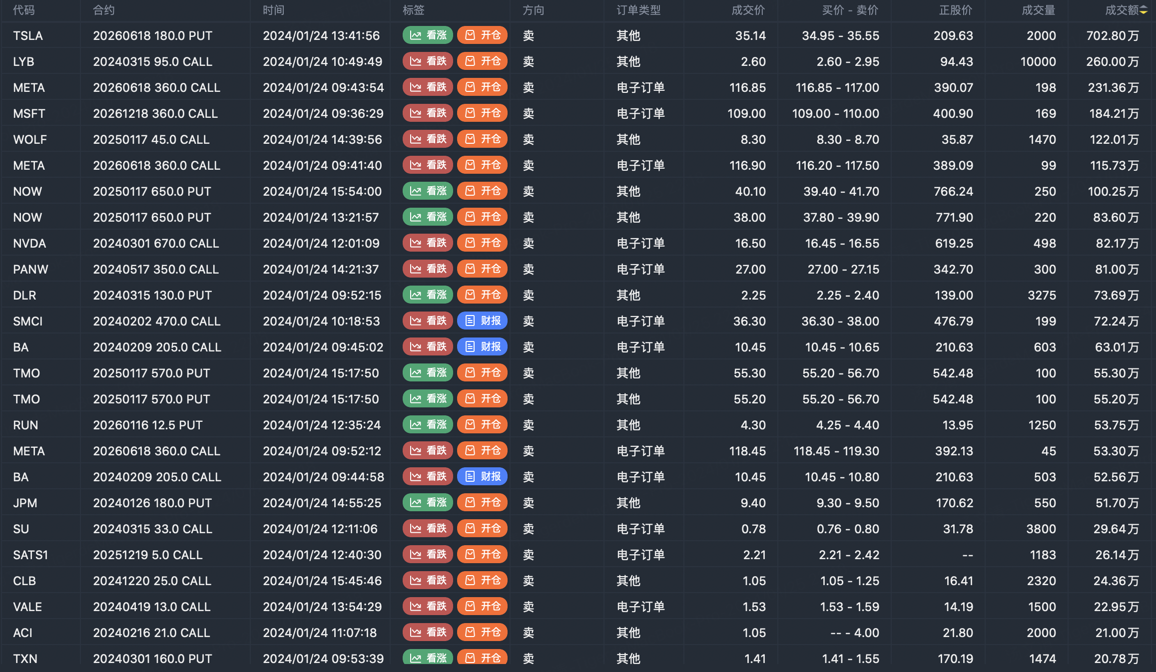 Note: This image data is from Tiger PC. This screen is a significant sell open position for an option contract in the market. A sell of a call option means that the trader believes that the underlying trend has peaked, and a sell of a put option means that the trader believes that the underlying trend has bottomed. These contract openings typically indicate significant activity in the underlying stock, including whether the trader is willing to accumulate a long or short option position.
