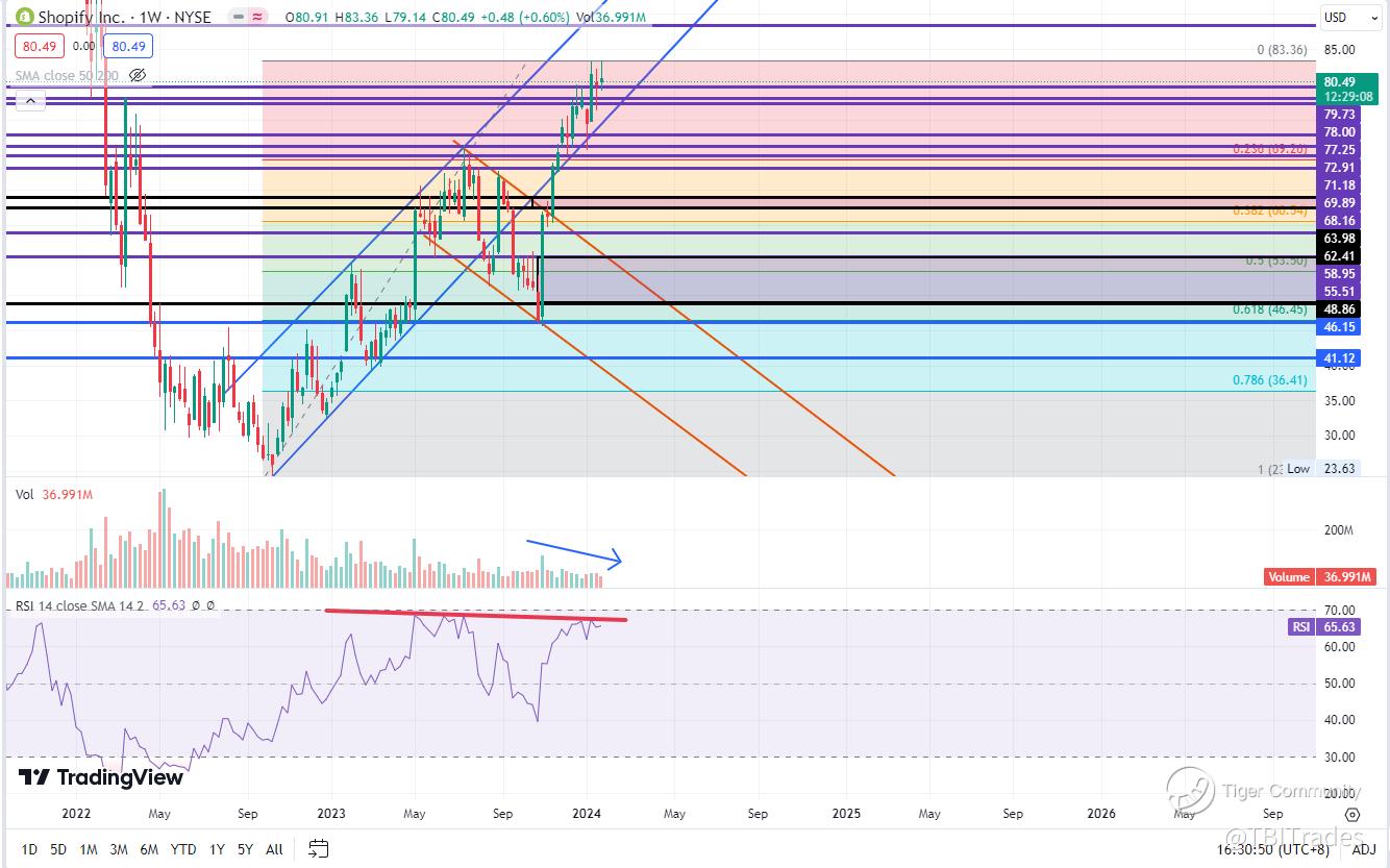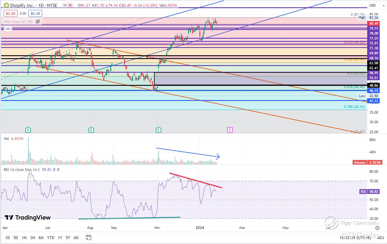 I am of the belief that 83.36 is the top for the time being, and expect SHOP to test lower before heading higher (i.e. healthy RSI reset). This pattern is reminiscent of GOOG before its last earnings. There was bearish divergence on weekly and daily timeframes which preceded a strong dump post-ER.
