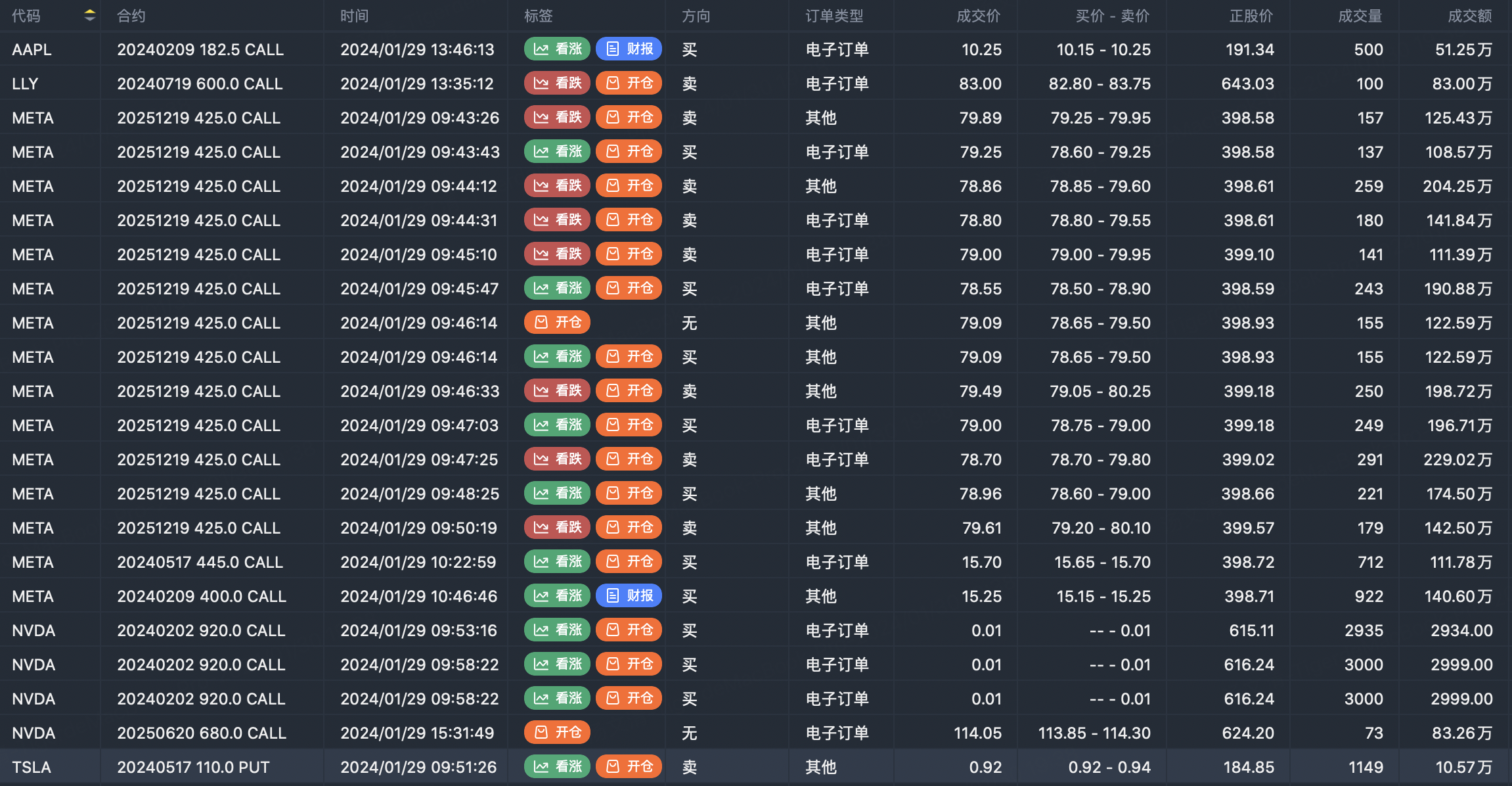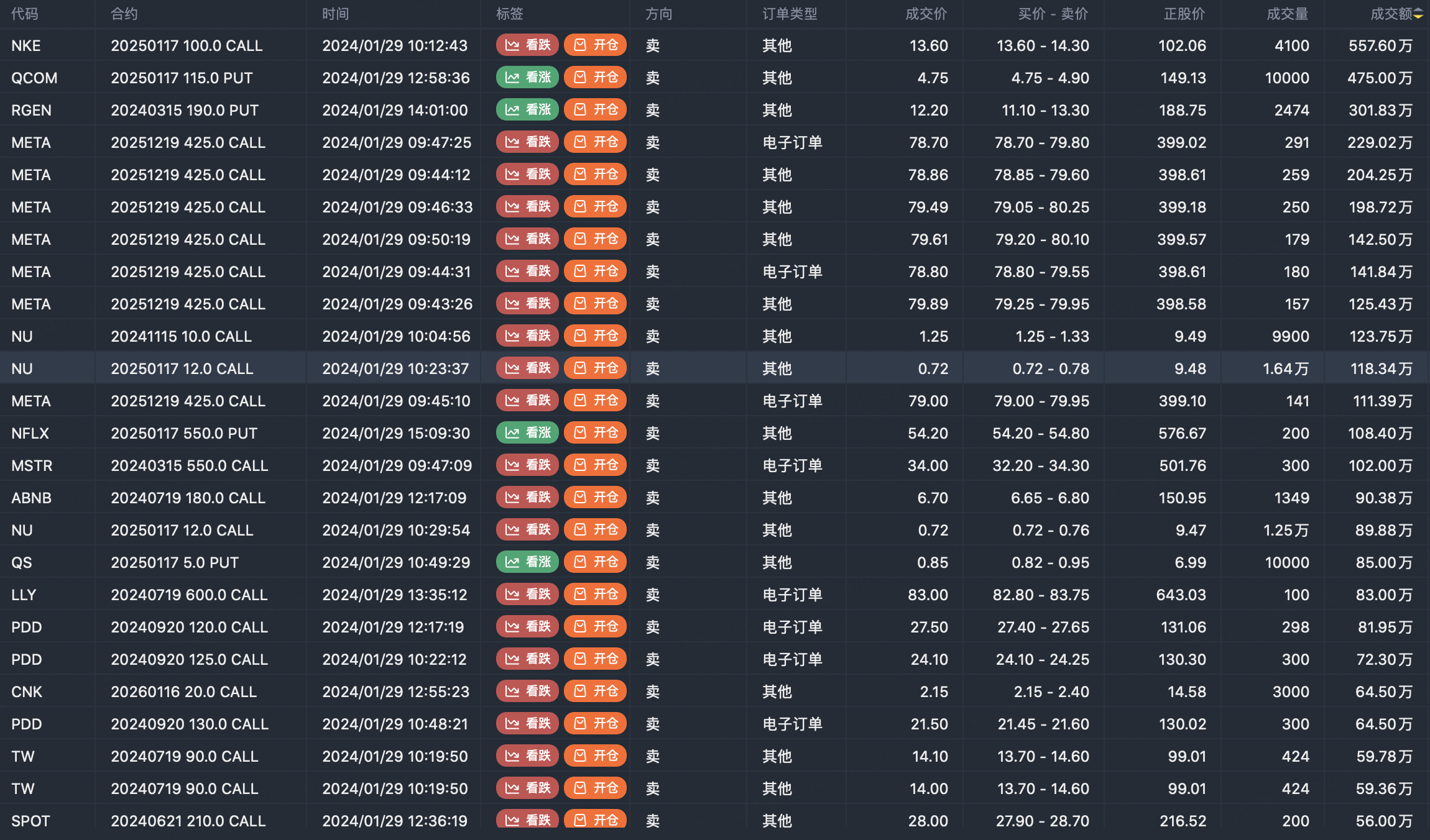 Note: This image data is from Tiger PC. This screen is a significant sell open position for an option contract in the market. A sell of a call option means that the trader believes that the underlying trend has peaked, and a sell of a put option means that the trader believes that the underlying trend has bottomed. These contract openings typically indicate significant activity in the underlying stock, including whether the trader is willing to accumulate a long or short option position.