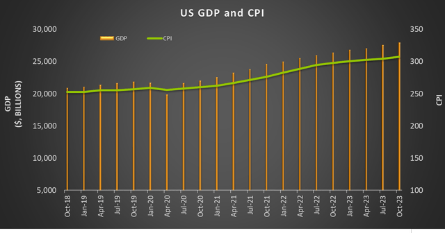 Quarter-over-quarter, the US GDP and the US consumer price index (or, CPI) increased almost equally from Q2 to Q3. Over a longer period (two years), the US GDP growth rate has outpaced CPI. So, the economy does not throw any warning signs for BV's near-term outlook.