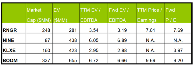RNGR's forward EV/EBITDA multiple is expected to contract versus the current EV/EBITDA. Also, the fall will be steeper than its peers, typically resulting in a higher EV/EBITDA multiple. The company's EV/EBITDA multiple (3.5x) is lower than its peers' (NINE, KLXE, and BOOM) average. So, the stock is undervalued versus its peers.
