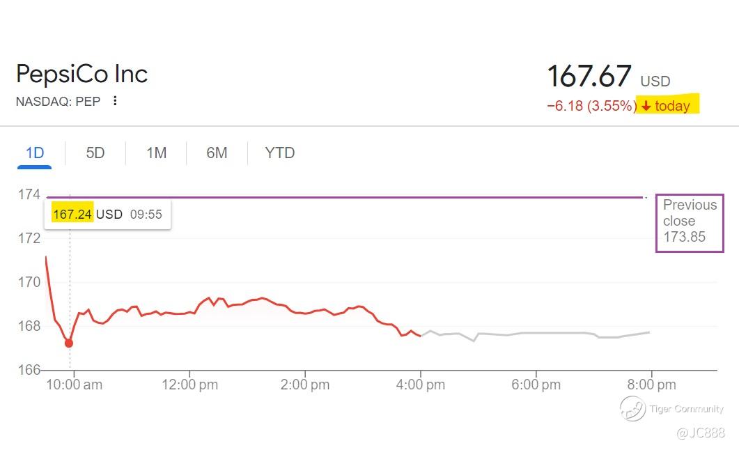 Just like that, Pepsi closed lower on Friday, by -3.55% to $167.67 per share. (see above)