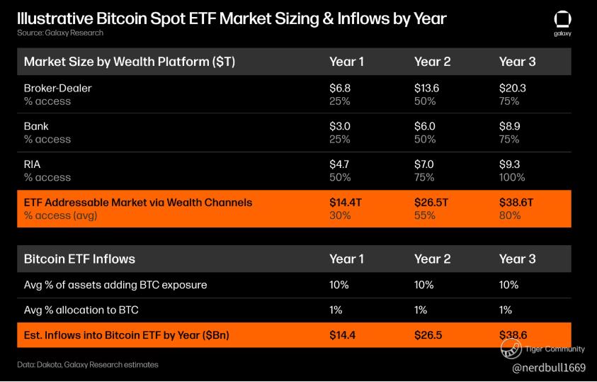 Looking ahead, the upcoming halving event in April 2024 may further contribute to the price rally, as high demand meets a supply shock. Estimating inflows into Bitcoin ETFs: Based on these market size estimates, if we assume that BTC is adopted by 10% of total available assets in each wealth channel with an average allocation of 1%, we estimate $14bn of inflows into a Bitcoin ETF in the first year following an ETF launch, ramping up to $27bn by the second year and $39bn by the third year post-launch. Of course, if Bitcoin spot ETF approvals are delayed or denied, our analysis would be altered by timing and access restriction. Or if poor price performance, or any other factor, leads to lower-than-expected access or adoption to a bitcoin ETF, our estimates could prove too aggressive. On the other hand, we believe our assumptions on access, exposure, and allocation are conservative, so inflows could also be higher than expected.