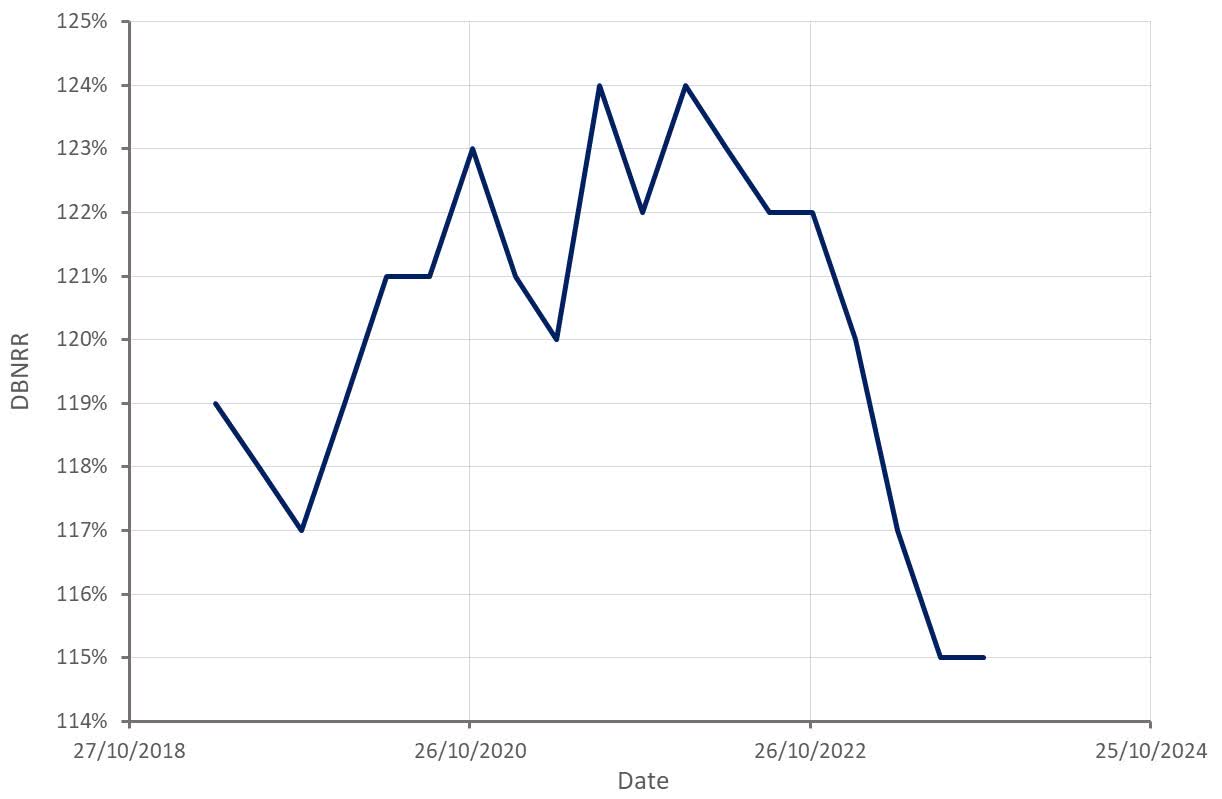 Figure 4: Okta Dollar-Based Net Retention Rate (source: Created by author using data from Okta)