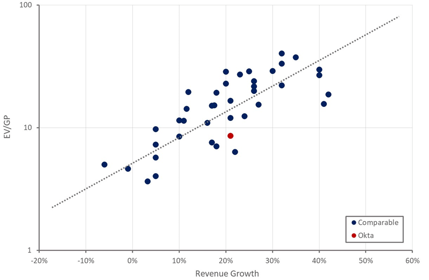 - While Okta's valuation is modest given the company's potential, share price performance is likely to be determined by the company's ability to stabilize growth and continue progressing towards breakeven.