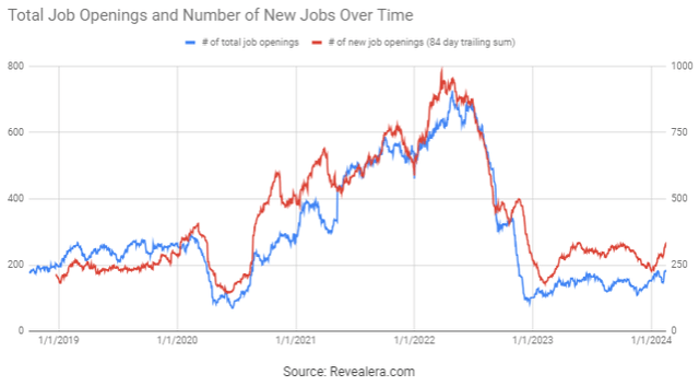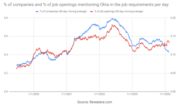 The number of job openings mentioning Okta in the job requirements has been fairly steady over the past 12 months, although it remains depressed relative to 021 and 2022 levels. This suggests that demand remains sluggish, something that is supported by weaker growth in Okta's customer count.