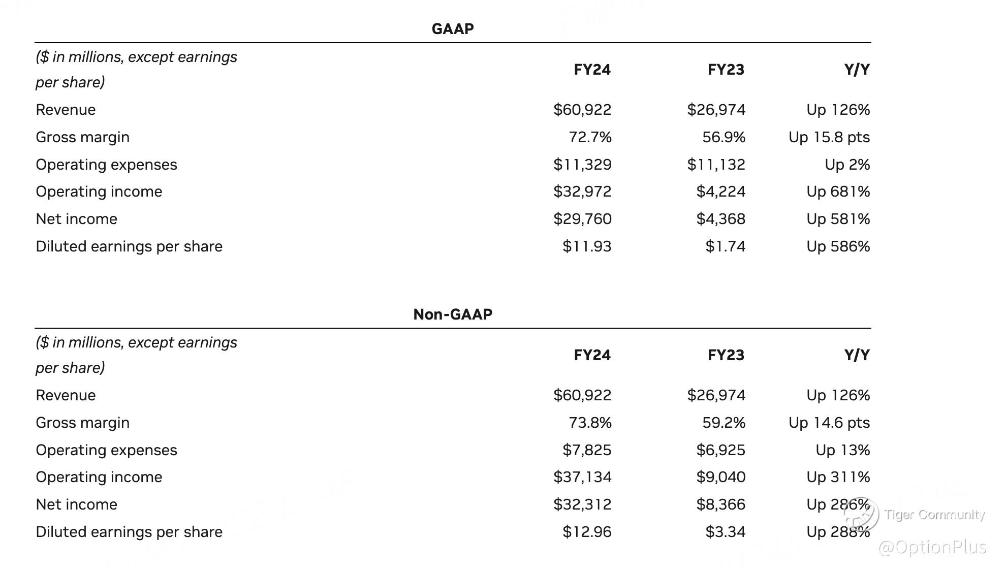 The annual revenue for 2023 surpassed $60 billion, a year-over-year growth of 126%. Notably, despite doubling the revenue, the gross margin increased by nearly 15%, reaching a non-GAAP gross margin of 74%.I have to highlight the exceptional efficiency, considering NVIDIA is often considered a hardware company.