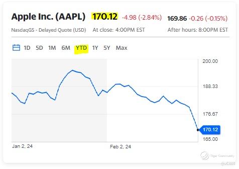 Shares of the Cupertino, California-based company have shed nearly -12% in 2024 alone, after closing at a record in December and in the process, erasing more than $300 Billion in market value. (see below)