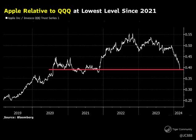 The iPhone maker continues to set new lows relative to the $252 Billion - $Invesco QQQ Trust-ETF(QQQ)$ that tracks the Nasdaq 100 Index.