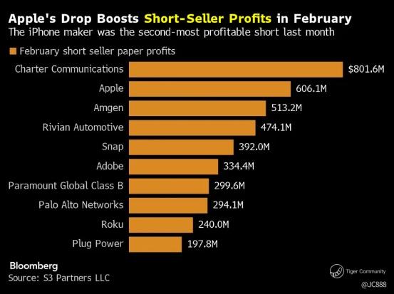 According to S3 Partners (a data analytic firm), Apple was the the stock market’s second-most profitable short position in February at $606 million in paper profits. (see above)