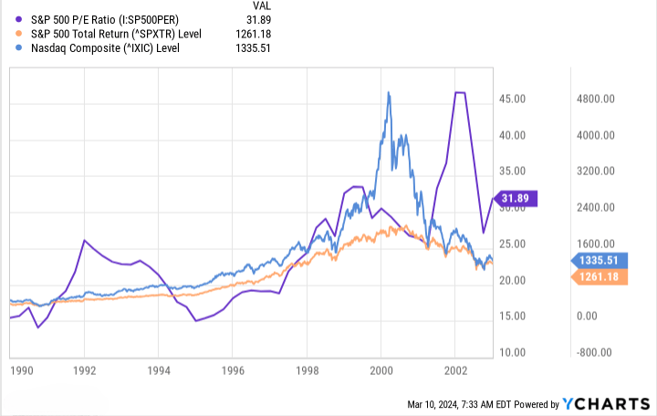 We saw this in the 1990s with internet stocks, peaking before the market crashed in 2000. The $S&P 500(.SPX)$ had a P/E ratio in the low-30s at its bubble peak (I couldn’t get reliable data for the $NASDAQ(.IXIC)$ Composite) and tech stocks got to insane valuations as FOMO set in.