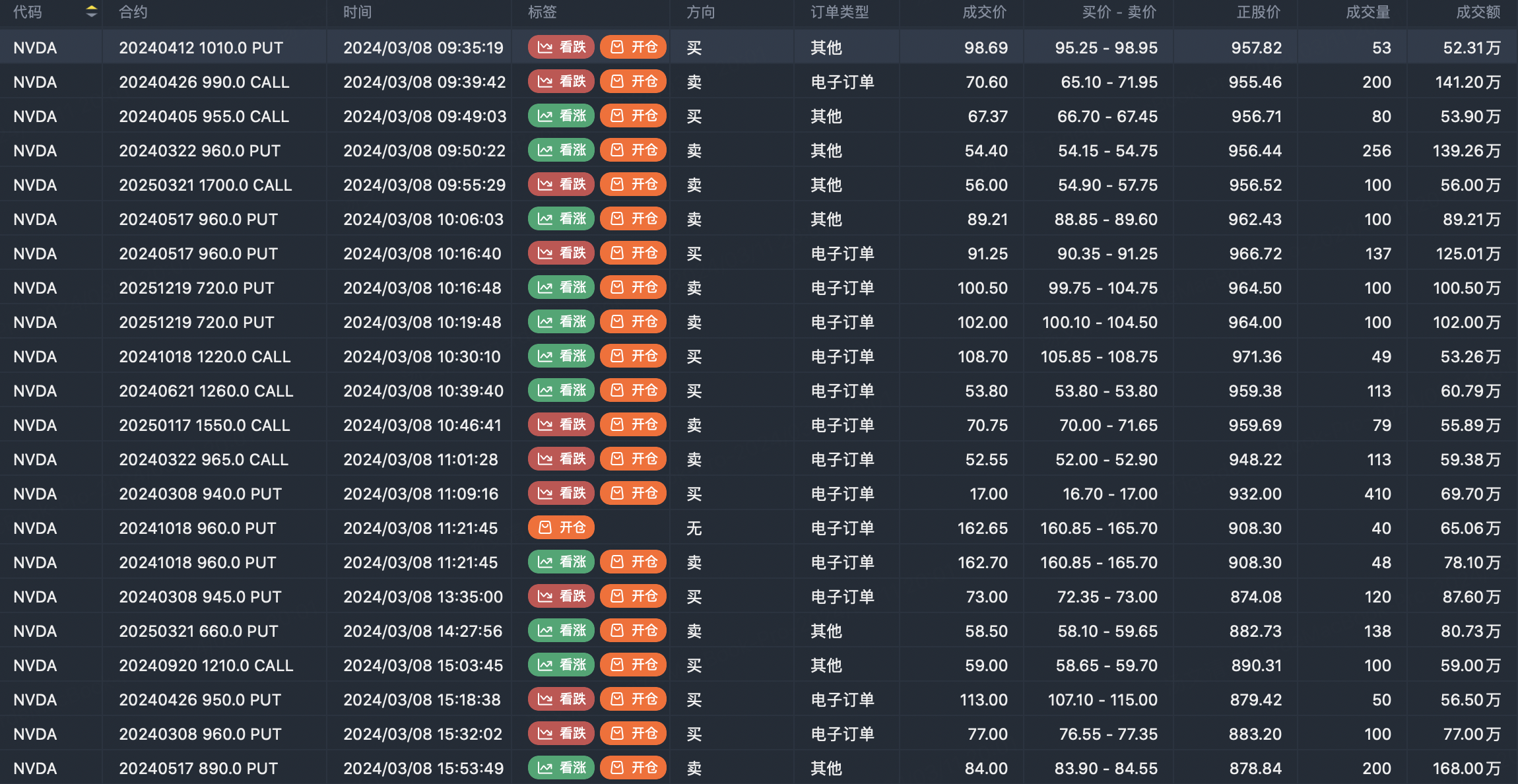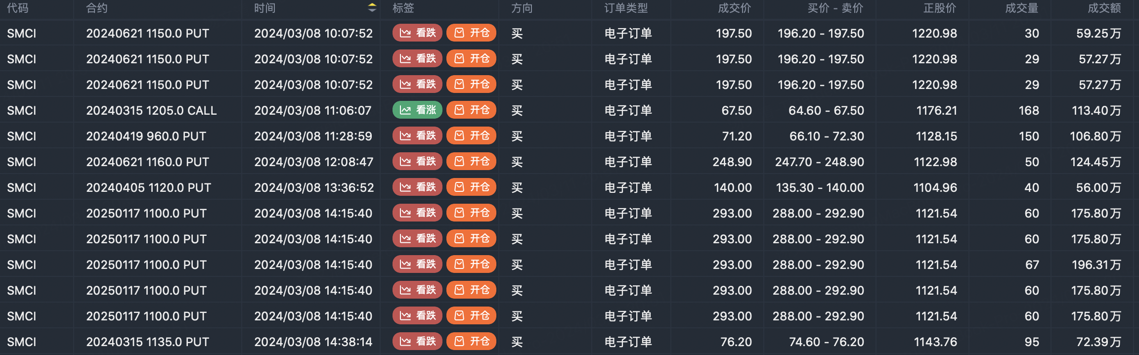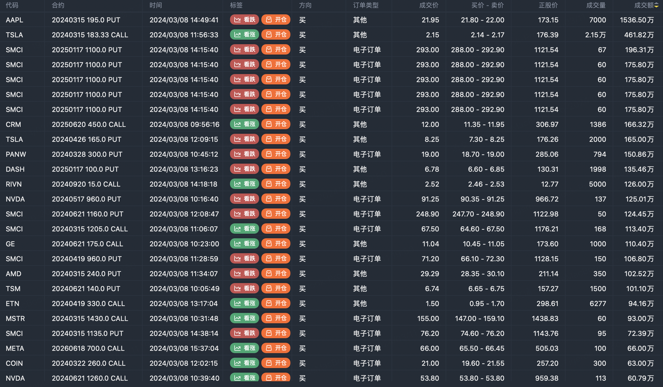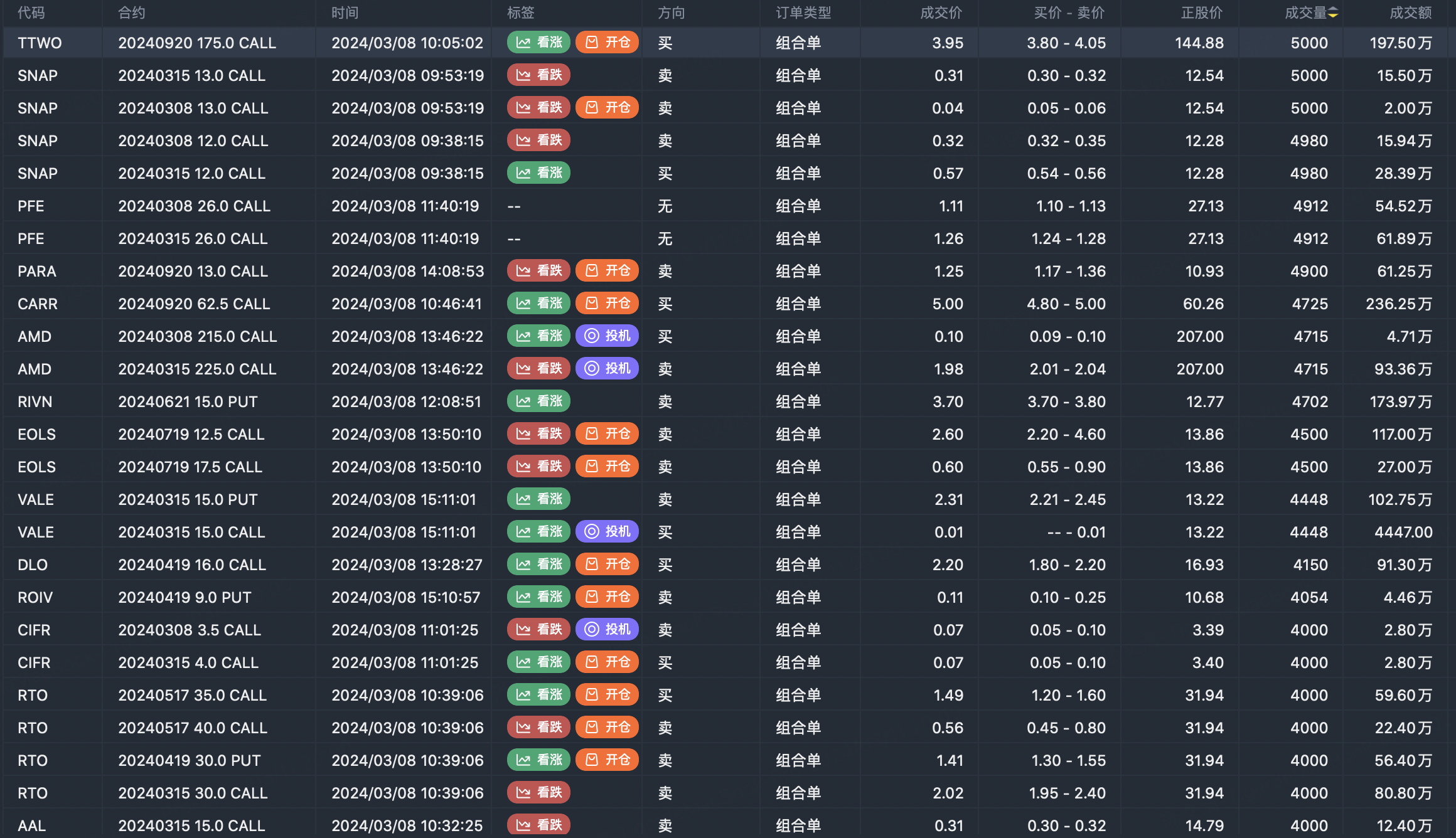 Note: This image data is from Tiger PC. This screen is a significant sell open position for an option contract in the market. A sell of a call option means that the trader believes that the underlying trend has peaked, and a sell of a put option means that the trader believes that the underlying trend has bottomed. These contract openings typically indicate significant activity in the underlying stock, including whether the trader is willing to accumulate a long or short option position.