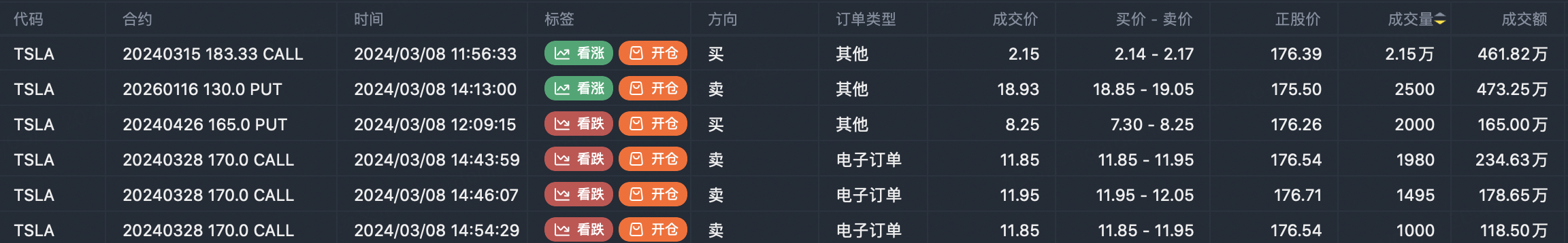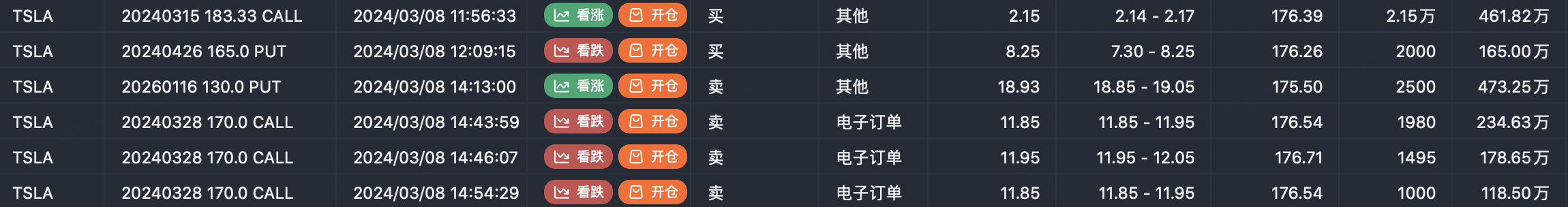 $Tesla Motors(TSLA)$ fell for the third day in a row, and Tesla shares have fallen more than 11% so far, wiping out more than $70 billion in market value. Morgan Stanley analyst Adam Jonas cut his price target on Tesla to $320 from $345, saying demand for electric vehicles in key markets continues to weaken despite the steep price cuts. Option transaction shows large CALL option sell order $TSLA 20240328 170.0 CALL$ .