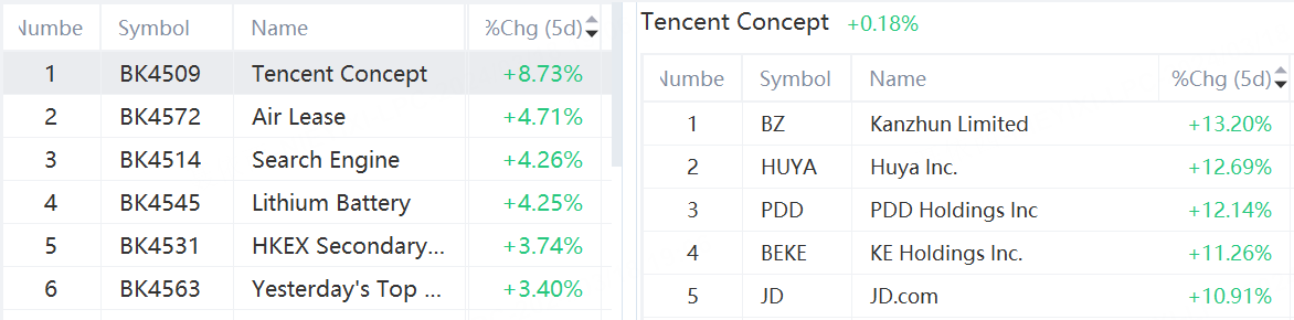 The best-performing concepts are Tencent concept, air lease, and search engine.