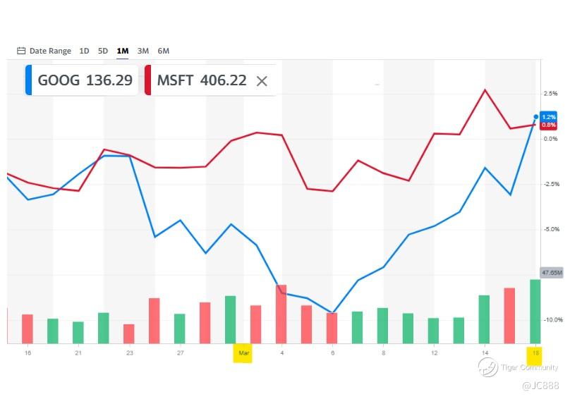In contrast, $Microsoft(MSFT)$ (Google’s direct AI competitor) stock price has been racking up during past month. It trended downwards when attention returned to Google.