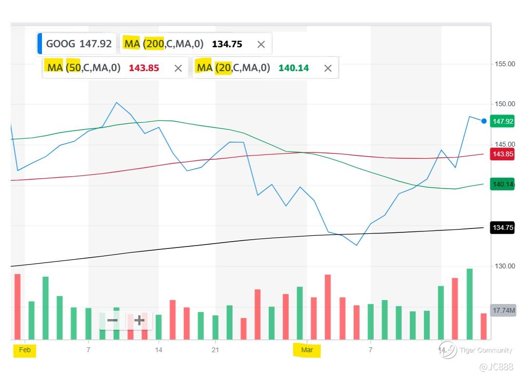Looking at Google’s moving average (see above), its price index is sitting above its 20-day, 50-day and 200-day moving averages (ma).