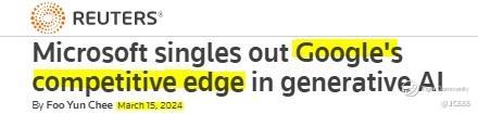 In a bid to defend itself from EU scrutiny on Generative AI, $Microsoft(MSFT)$ CEO concedes that Google has an advantage in AI, due to the infrastructure and the full vertical integration across its platform, especially YouTube with Google.