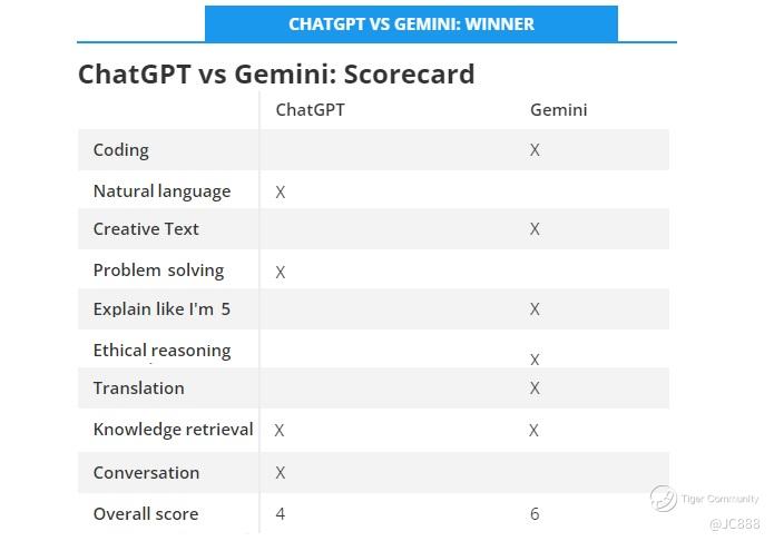 Winner - Gemini, winning on 6 of 9 challenges. ChatGPT had victories on 4 of 9 challenges.