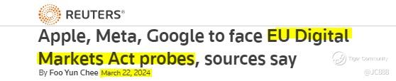 $Apple(AAPL)$ , $Meta Platforms, Inc.(META)$ and $Alphabet(GOOG)$ are rumoured to be investigated for potential violations of the European Union's Digital Markets Act (DMA).