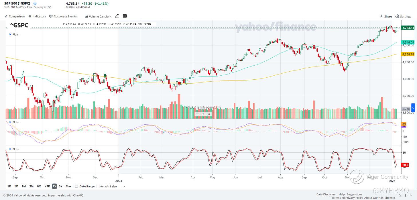 From the chart above, we can see that the S&P500 has grown 25% in 2023 (from 3rd Jan 2023 to the last day 29 Dec 2023). Over the 247 trading days, the S&P500 started the year with 3824 and closed the year with 4769. This should be good news for a start.