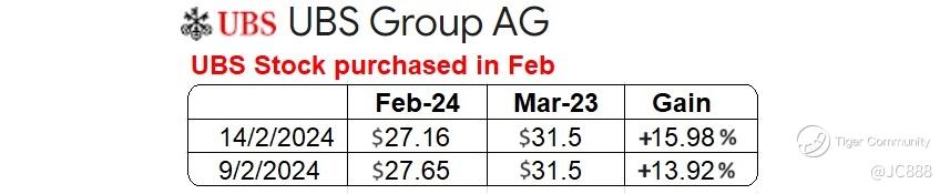 In my 15 Feb 2024 post, I have touched on Swiss bank $UBS Group AG(UBS)$ and how I managed to “dip buy” when US market was very nervous about the first Consumer Price Index (CPI) report of 2024.