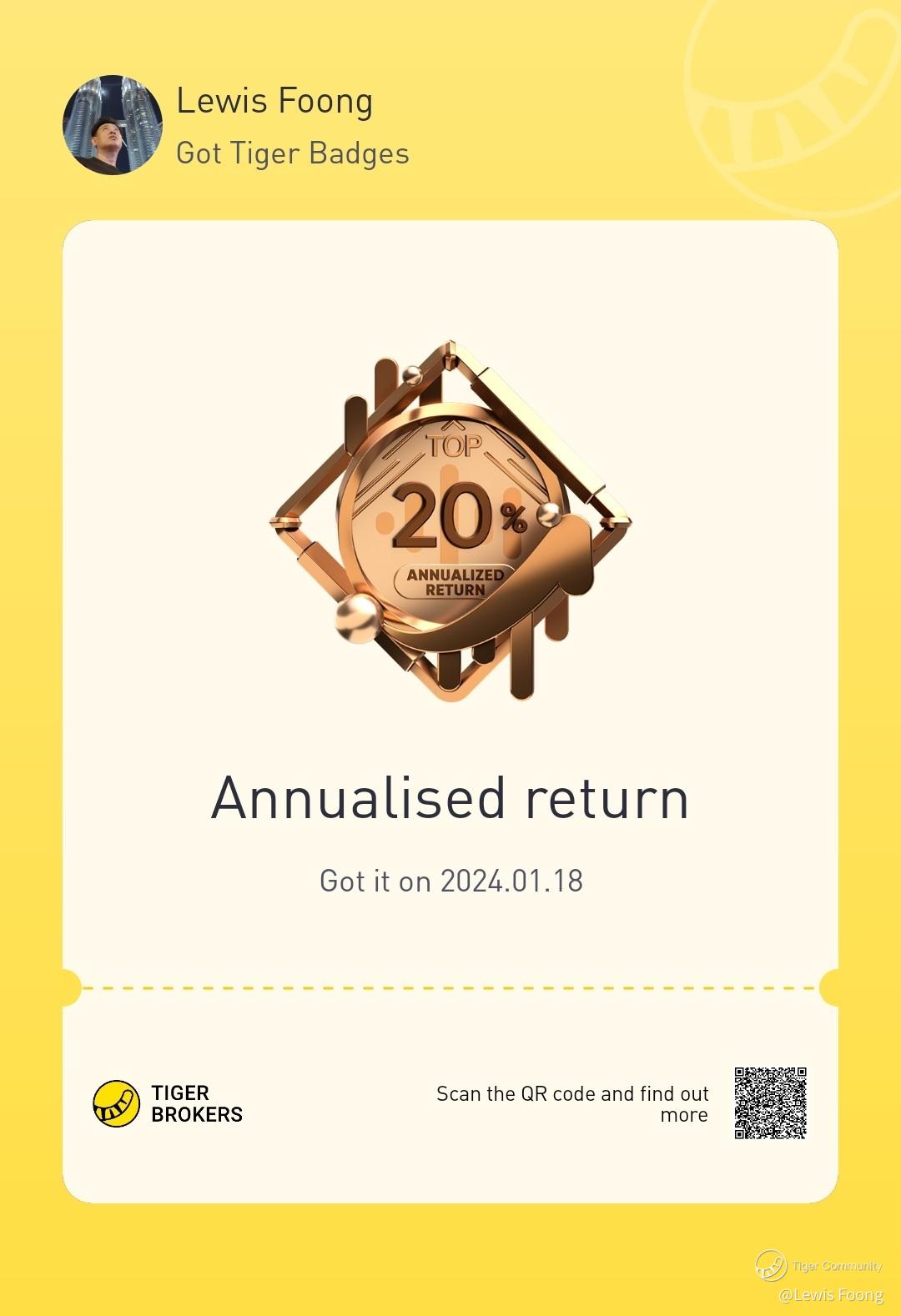 Hi tigers, great to share my achievement, I'm among the top 20% higher annual return in tiger family. I am striving 2 years to improve my market sense whatever in Marco or micro economics events. Furthermore, I did many homework to understand the economic structure and what about the market circulation. For my advice, peaceful mind setting, never too much disturbing although the market up and down and 'less is more ' never turn on your platform app more than 3 times once your investment placed. There are my sharing. Tigers best luck.
