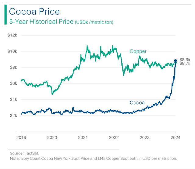 This led to a nearly 138% surge in cocoa prices, exceeding $10,000 per tonne for the first time. Actually, cocoa futures continuously rose in 2023, with a yearly increase of over 70%.