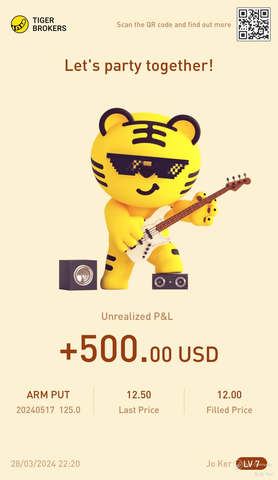 Hi all! Yesterday is the best day for Dow this year and S&P 500 close at ATH. So it is a very Green Day which the market bulls still want no reversal ideas entertained at all. Therefore, my theory that this could be the market reversal is negated. However, the chips stock is definitely losing it's mojo, especially ARM which is extremely overvalued. That is why it is still red yesterday and sell down. I believe the stock looks as bad in technical analysis as it's fundamentals and value now at current prices. There are even professional traders cashing in two years earlier for big volume options because the current prices is just way out of proportion to the stock value! Therefore, my advice is to continue to short ARM or buy it's put options to join in the profit taking slide of the stock. Huat Ah for everyone!$ARM 20240517 125.0 PUT$