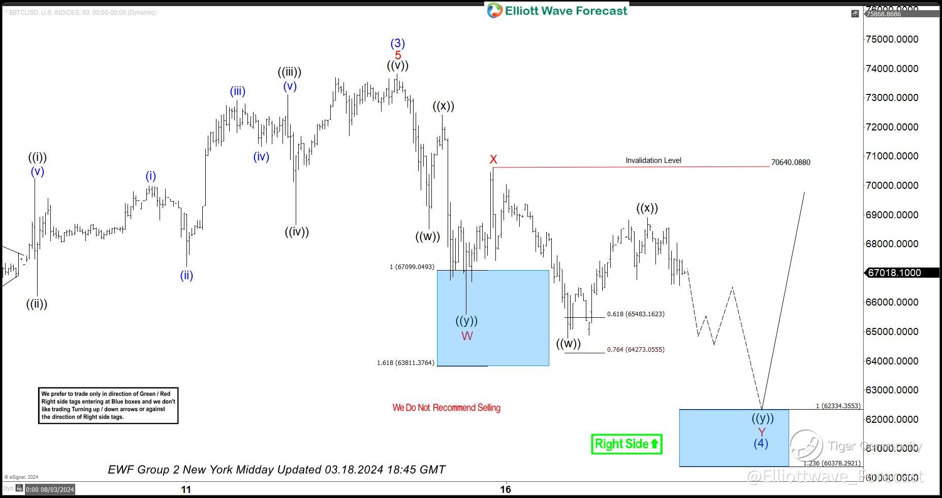 Here’s the 1-hour Elliott wave chart from the 3/18/2024 NY Midday update. In which, the short-term cycle from the 1/23/2024 low ended in wave (3) at $73814 high. Down from there, the BTCUSD made a pullback in wave (4) to correct that cycle. The internals of that pullback unfolded as Elliott wave double three structure where wave W ended at $65595 low. Wave X bounce ended at $70640 high and wave Y managed to reach the blue box area at $62334- $60378. From there, buyers were expected to appear looking for the next leg higher or for a 3 wave bounce minimum.