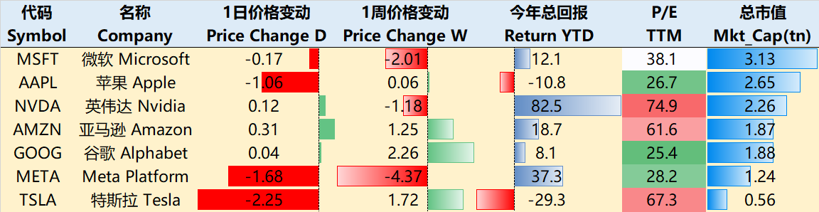 As of the close on March 28th, over the past week, the best performers among big tech companies were $Alphabet(GOOGL)$ $Alphabet(GOOG)$ +2.26%, $Amazon.com(AMZN)$ +1.25%, $Tesla Motors(TSLA)$ +1.72%, $Apple(AAPL)$ +0.06%, $NVIDIA Corp(NVDA)$ -1.18%, $Microsoft(MSFT)$ -2.01%, $Meta Platforms, Inc.(META)$ -4.37%.