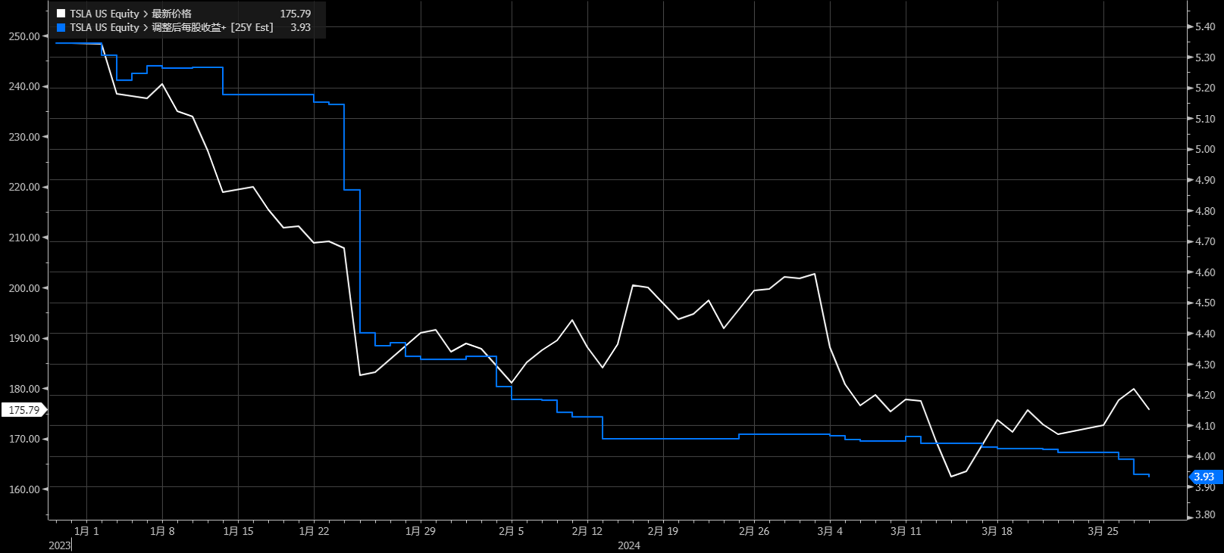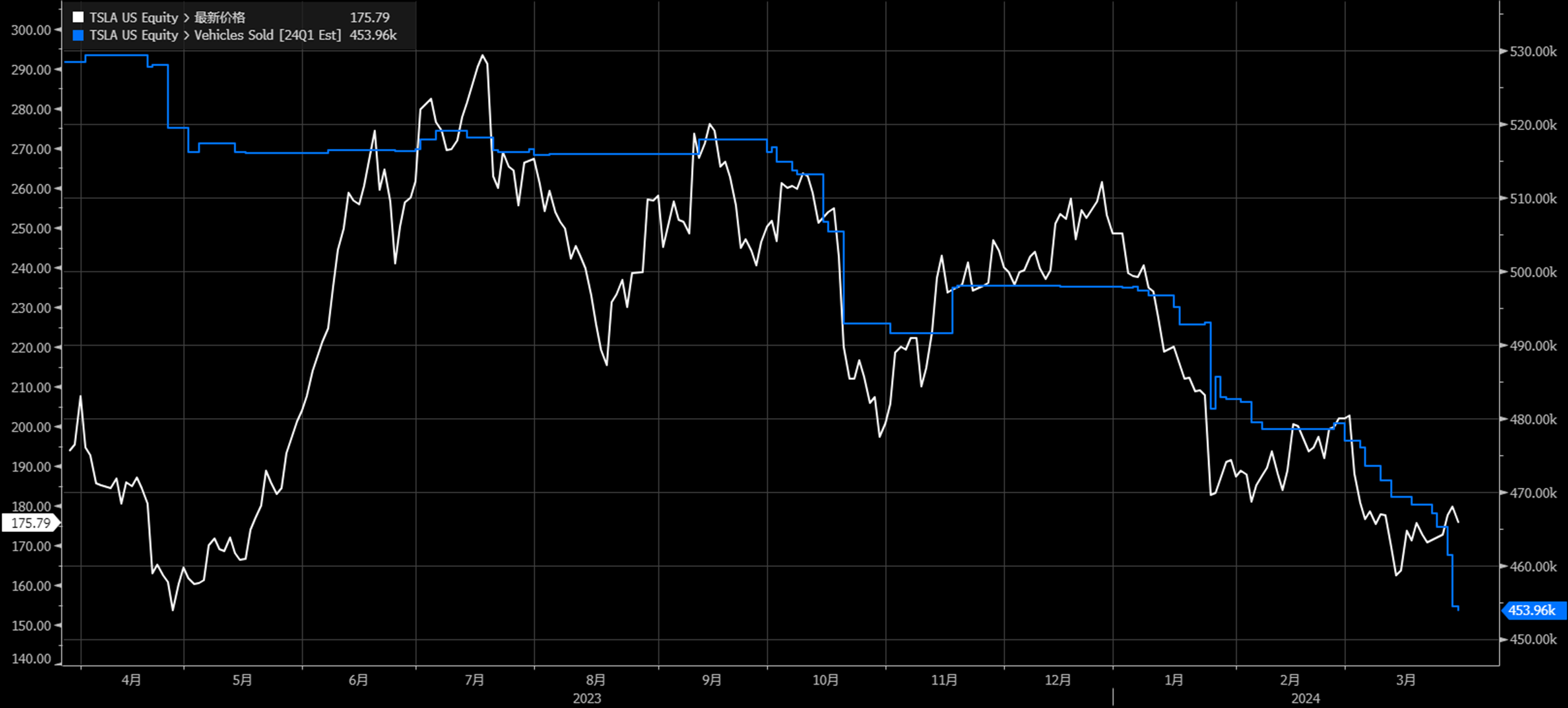 A weak Chinese market, with a Q1 delivery volume of 457,000, lower than the previously expected 494,000 units. Wall Street's consensus forecast has been continuously lowered since the beginning of the year, especially with intensive reductions in March, and the reduction in the second half of March was substantial.