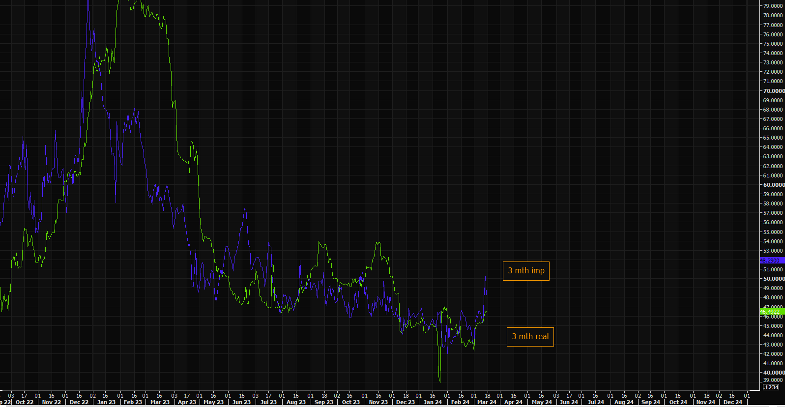 The Realized Volatility of 3 months is continuously rising, and the Implied Volatility is at a relatively higher position compared to RV.