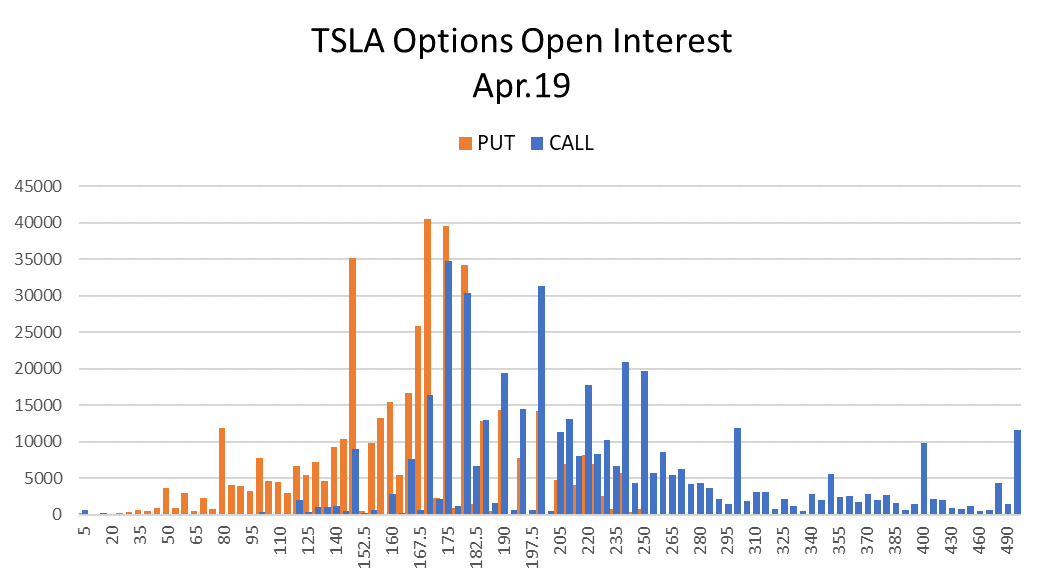 The IV for the week of the April 19th earnings report is rising, and the number of unexpired options being bet on is also rising. The skewness is also at -0.58, with PUT trades still more popular. 140 is an important position for PUT, but it also means that there are not a few people willing to take the plate at this point. CALL, on the other hand, is more scattered, with plenty of speculative orders still at 200-250.
