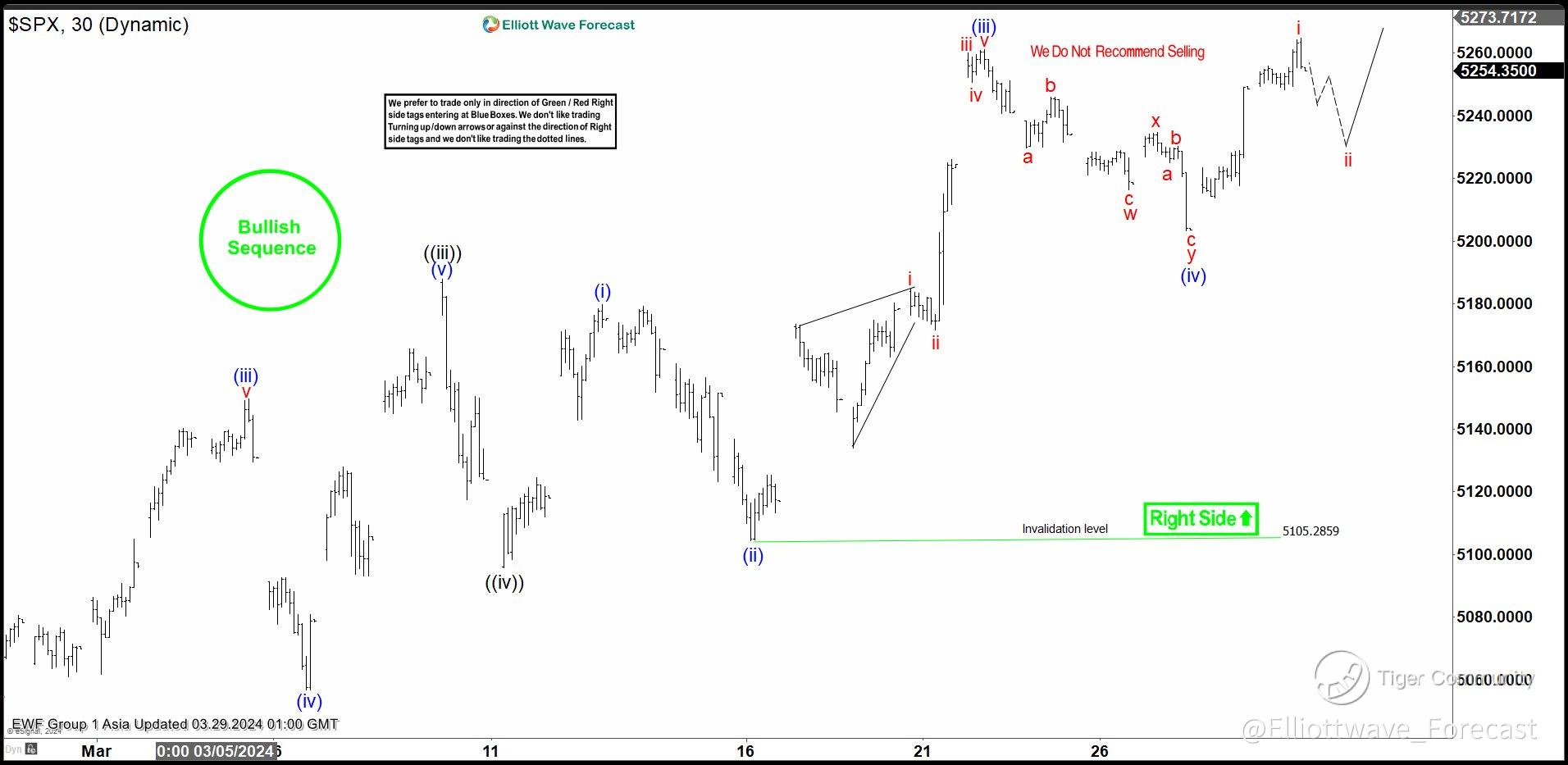 Short Term Elliott Wave view in S&P 500 (SPX) suggests cycle from 1.6.2024 low is in progress as a 5 waves impulse. Up from 1.6.2024 low, wave ((i)) ended at 4931.09 and pullback in wave ((ii)) ended at 4845.15. Wave ((iii)) higher ended at 5187.78 as the 30 minutes chart below shows and pullback in wave ((iv)) ended at 5095.88. The Index has resumed higher in wave ((v)) with subdivision as another 5 waves in lesser degree.