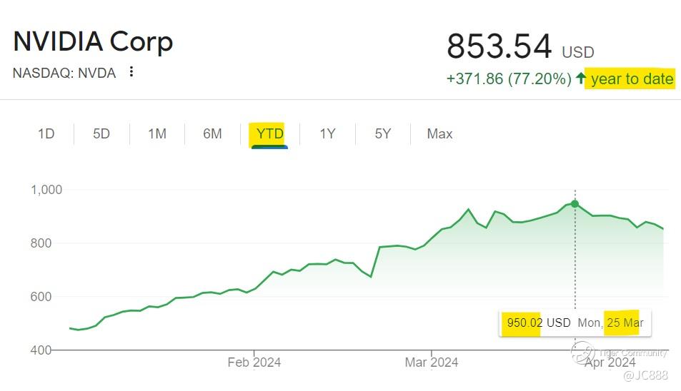 $NVIDIA Corp(NVDA)$ has been pulling back from its peak of $950 per share, attained on 25 Mar 2024. (see below)
