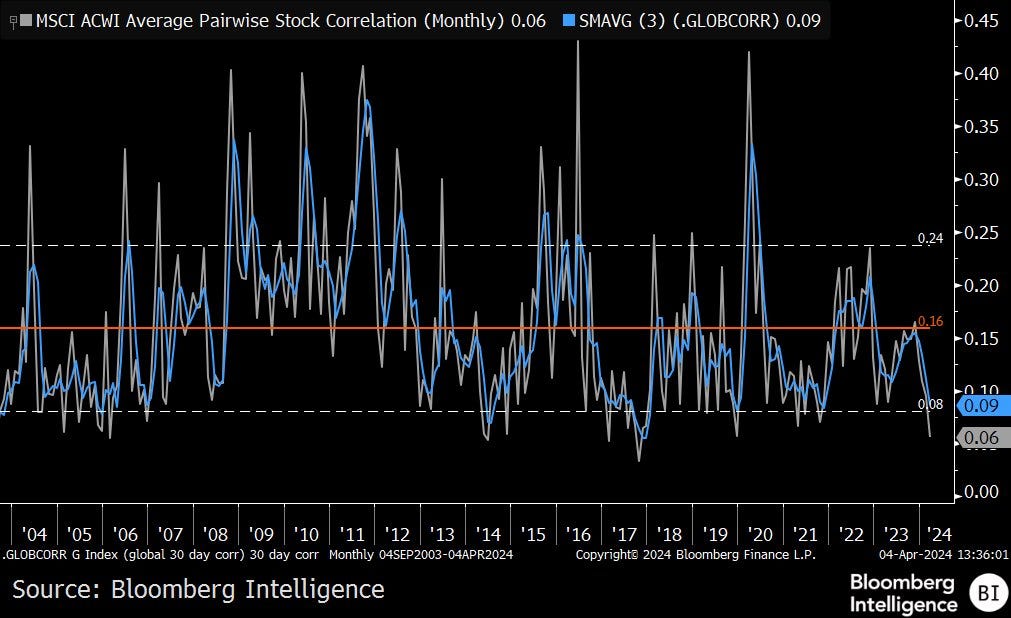 You’ve probably heard and maybe experienced that correlations go to 1 during a market crash (as investors switch from stock picking to sell everything). But the opposite tends to happen around market peaks: stocks become less correlated with each other, often one group is driving the market up, and maybe even some emerging weak spots see some stocks heading in opposite directions. But the key point is the crunch down in this indicator is a contrarian signal: an orange light on the traffic signals.