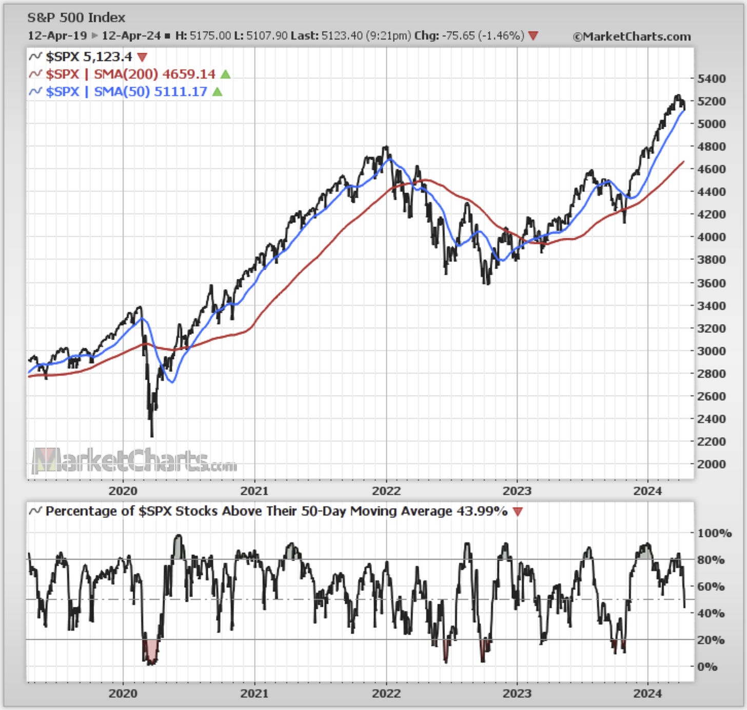 As geopolitical risk looms and higher-for-longer risk weighs, the S&P500 has slipped almost -3% off the high. The index has so far avoided breaking below its 50-day moving average, but as of Friday’s close 56% of individual stocks had broken below theirs (and chartists will note that the 50dma breadth indicator in the chart below has put in a bearish divergence signal — i.e. higher highs in the index vs lower highs in the indicator).