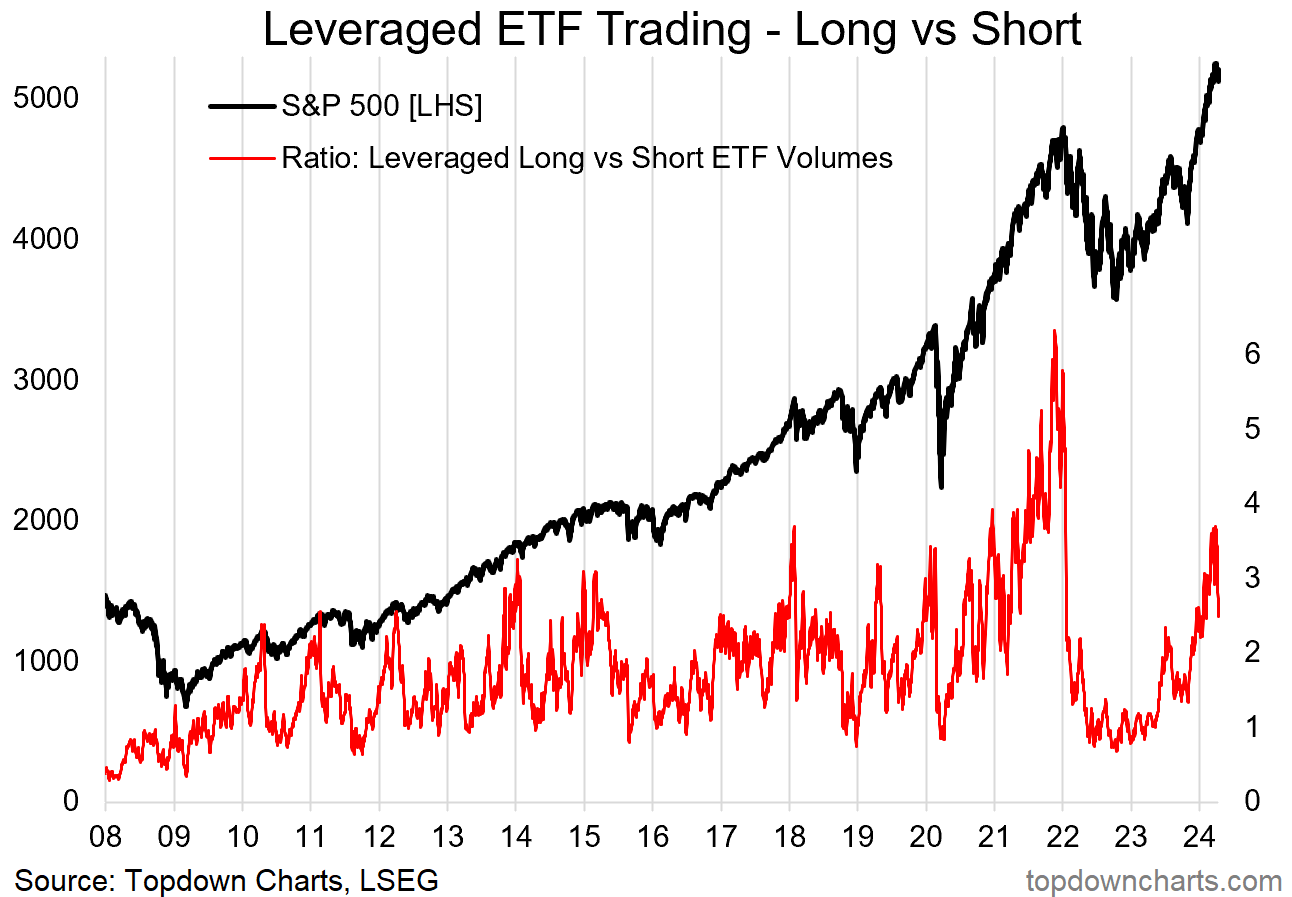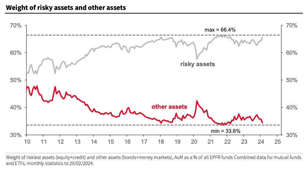 This chart is interesting for a couple of reasons. It shows investors now running the heaviest exposure to risk assets since the 2021 peak, but also despite all the gnashing of teeth and vocal bearish minority, investors as a group did not really swing heavily into “other” assets during the 2022 bear market (at least relative to historical weightings).