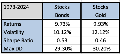 This table shows return stats for the classic 60/40 portfolio if you used bonds or gold as the 40% (and stocks as the 60%). Not much of a difference, if anything gold had a slight edge.