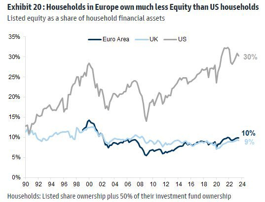 An interesting follow-on, US investors allocate 3x as much of their financial assets to equities than those in Europe/UK. Is this a culture thing? or is there something else to it… either way, all are toward the top end of their range.