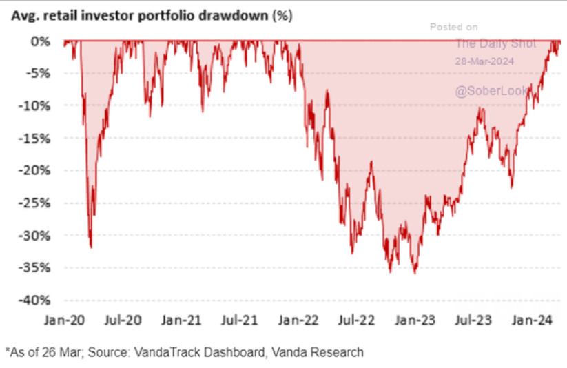 Likely thanks to sticking with those relatively high risk asset allocations, the typical retail portfolio has recovered back to its prior peak (after a traumatic -35% drawdown).