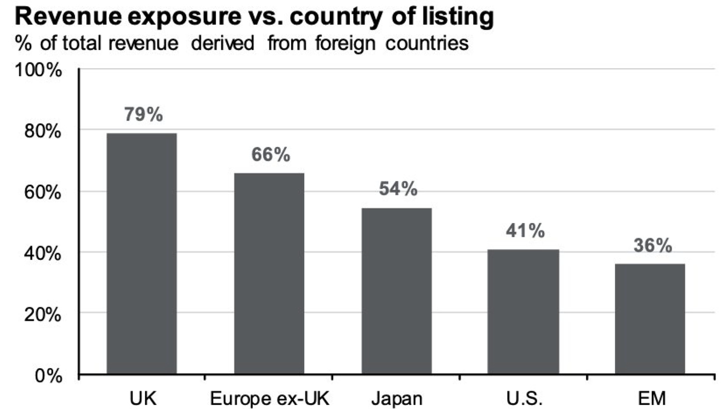 Another one of relevance to the UK — UK stocks get 79% of their revenues from foreign countries. Probably adds further food for thought for companies that are effectively global but listed on a lower valuation exchange. Also interesting from the standpoint that the UK economy matters less for UK corporate earnings.