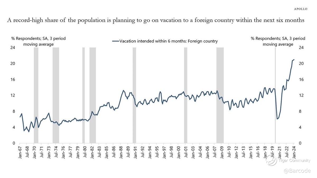 Consumer behavior reflects a robust economic sentiment, exemplified by a remarkable uptick in travel intentions: Approximately 22% of Americans are poised to embark on foreign vacations within the upcoming half-year period, a historic high compared to pre-pandemic levels when only about 13% entertained similar plans.