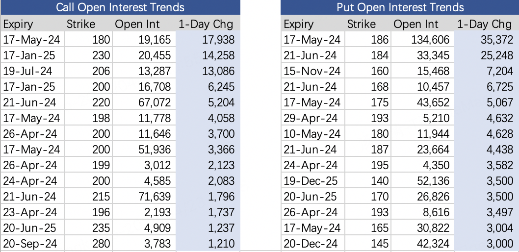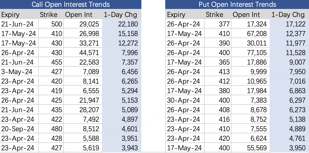 The most heavily traded put option is the $QQQ 20240426 377.0 PUT$ , with a strike of $377 expiring on April 26th, seeing an increase of 17,000 contracts. The $QQQ 20240517 410.0 PUT$ expiring on May 17th saw an increase of 12,000 contracts, paired with the $QQQ 20240517 410.0 CALL$ , forming a straddle combination.
