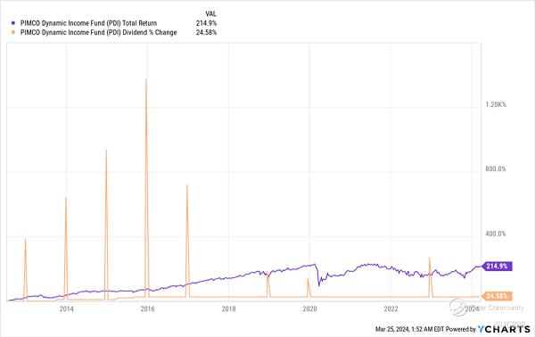 PDI's dividend has increased over time, but the big bonus is the extra payouts (orange spikes) from extra income they get. (see above)