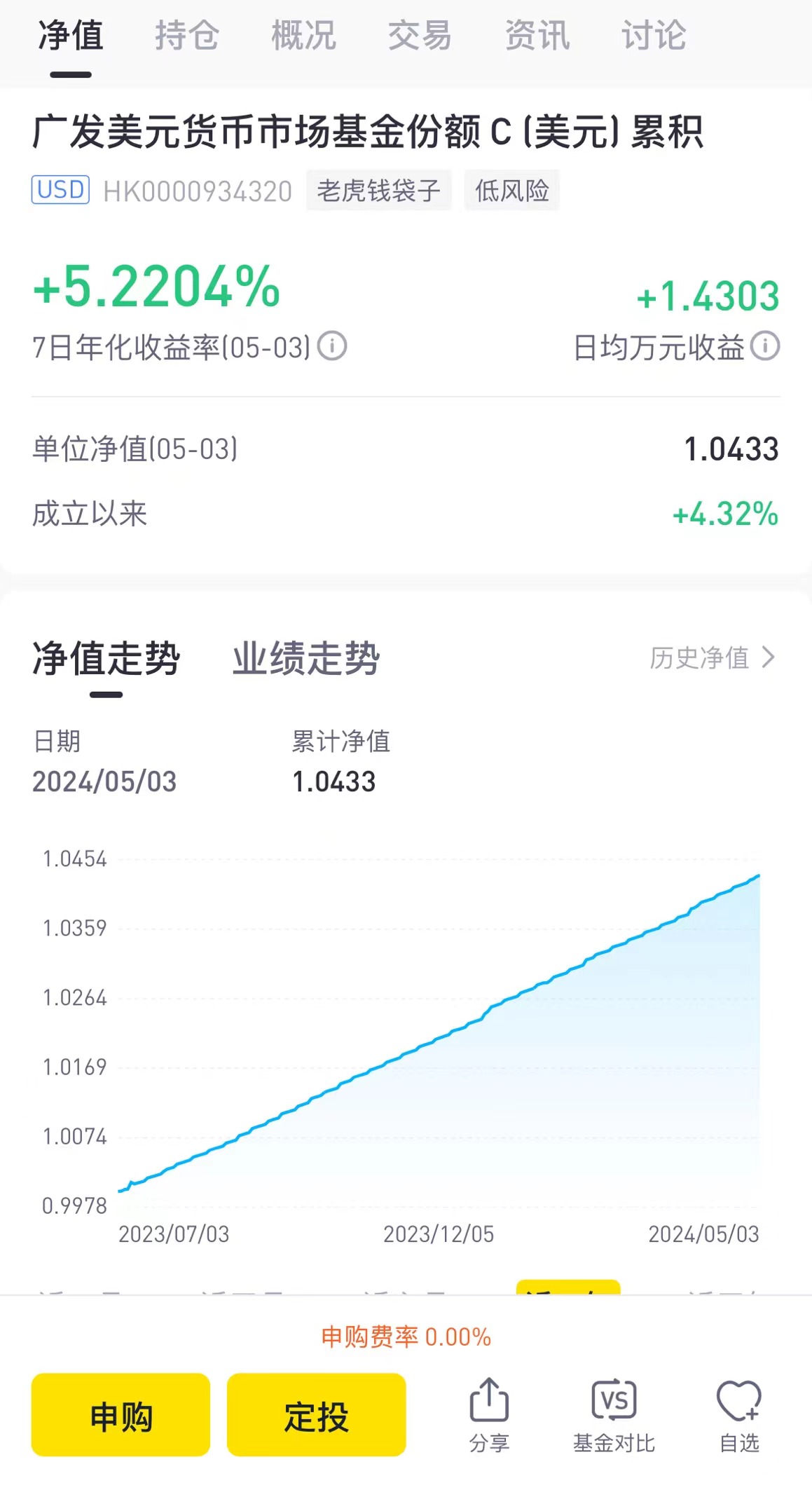 隨着美聯儲首次降息的預期推遲到Q4,當前5.25-5.5%的高息至少維持到9月。假設如現在市場預期今年降息兩次50bp,則到了明年利息仍然可以維持在4.75%-5%。相對於很多投資,老虎錢袋子的美元貨基產品在未來半年仍然是非常可觀的無風險現金配置。