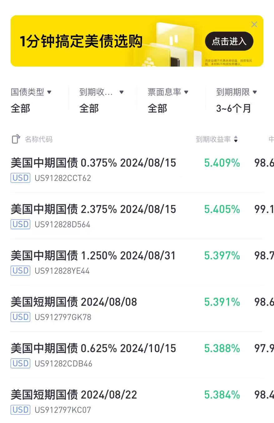 從老虎APP看了一下目前3-6個月短期美債的到期收益基本在5.4%,正是巴菲特口中,風險很小並且可以賺很多錢的事情。